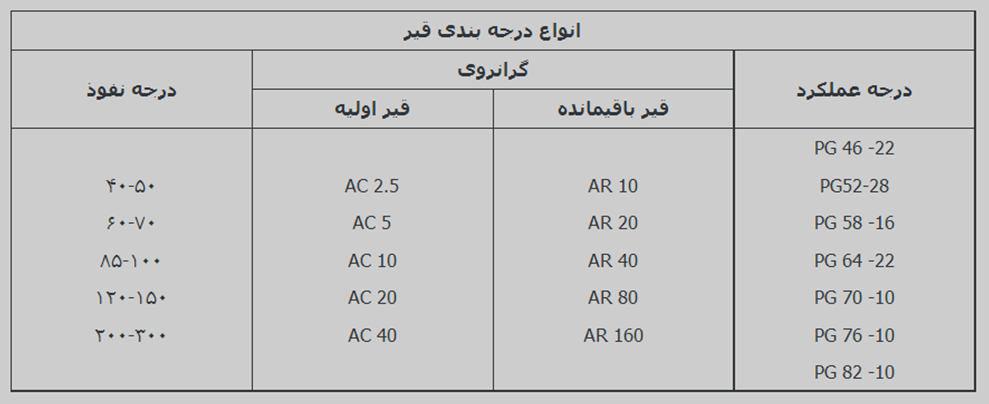 درجهبندی عملکردی (PG) بر اساس خصوصیات قیر در شرایط واقعی ازجمله شرایط آب وهوایی وتولید آسفالت میباشد که مبتنی بر رفتار کامل قیر و شناخت دقیق از خصوصیات عملکردی آن گزارش شده است. در جدول ۲خصوصیات درجه عملکردی با درجهبندی بر اساس نفوذپذیری و ویسکوزیته مقایسه شده است.